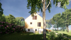 Projekt rodinného domu, ktorý bude postavený z ecococonu sme navrhli pre klientov, ktorí túžili po dome s otvorenou dispozíciou a podkrovnou galériou. Našou odpoveďou bol koncept kompaktného domu, ktorý je pekne vzdušný a útulný. Denný priestor je otvorený po celej výške domu a je doplnený o podkrovnú galériu s oddychovou zónou a výhľadom do okolia. Galériu si vedia klienti čiastočne uzavrieť a vytvoriť tak ďalšiu izbu. Dom je situovaný na svahovitom pozemku a preto je časť domu podpivničená a skrytá. Do priestoru suterénu sme situovali záhradný sklad a technológie domu.