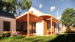 vytvára prepojenie so záhradou, dvorom a výhľadom do ulice pri otvorených veľkých dvojkrídlových dverách do spálne, kedy nám vzniká pekne veľký vzdušný priestor. Dom nám zároveň ponúkne aj vytvorenie klasickej útulnej spálne, pri zavretých dverách, takže majitelia si môžu ladiť svoj dom podľa ich aktuálnej nálady a potrieb. Za domom hlbšie v záhrade je situovaná terasa, ktorá je prepojená aj so záhradným domčekom, skladom, ktorý je už zase bližšie k plánovaným zeleninovým záhonom. Celý tento koncept sme poňali tak aby dom ponúkol jasné a logický dané prepojenia a väzby v čo najkompaktnejšom priestore. Vďaka čomu bude kamarátsky aj na staré kolená a ponúkne dôstojné a plne využiteľné bývanie. No nezabudli sme ani na návštevu, ktorej sme vytvorili mazaním v podkroví, takže nebude potreba rozkladať sedačku a podobne.